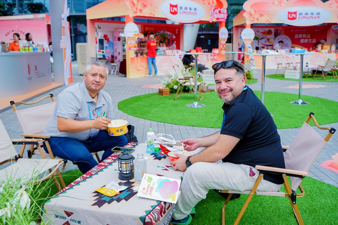 以“食”为媒,以“梗”会友。嘉年华现场特别设置中西美食对碰特色体验业态以及粤语趣味挑战环节,中西风味的创意碰撞令人耳目一新:广州老字号公司珀萃然推出0酒精广府风味的“氮氮菠萝啡”,还原菠萝啤清爽酸甜口感;拉丁餐厅澳门葡式猪扒包与大师兄外皮劲道、内馅喷香的肉夹馍同台竞味;烤牛肉与焖牛腩各展鲜香,肠仔酥与鲜虾炸春卷酥脆交织……多重风味在舌尖层层绽放,让中外客商沉浸式感受中西美食文化的交融魅力。