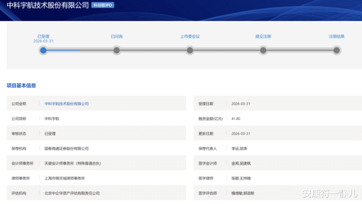 2026年3月31日,上交所科创板受理了中科宇航技术股份有限公司的IPO申请。这家被业内称为商业航天“国家队”的企业,拟募资41.8亿元,不仅创下民营商业航天领域最大募资纪录,更标志着中国商业航天正式进入资本驱动的规模化发展阶段。